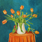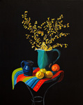 2012Stilleven in felle kleuren op zwarte achtergrond met kan met forsythia, sinaasappel, citroenen, kannetje en kleedje op een tafel