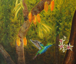 2017Kolibrie in 'oerwoud' van cacaobomen met vruchten en bloesem