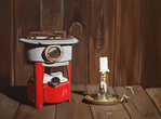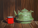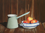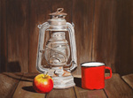 2017Stilleven met petroleumlamp, rode emaille mok en appel