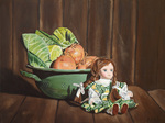 2017Stilleven met emaille vergiet met spitskool en uien en een porceleinen pop ervoor